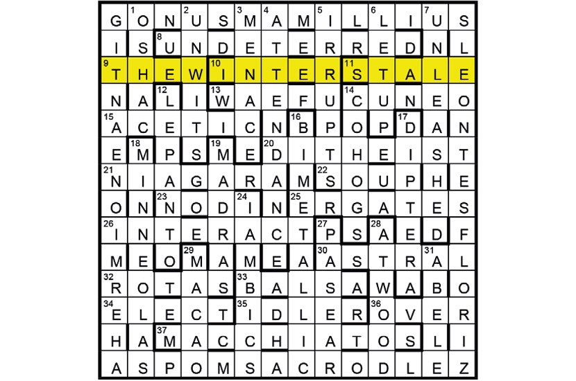 The play was The Winter’s Tale by Shakespeare. The perimetric dramatis personae are MAMILLIUS, LEONTES, FLORIZEL, DORCAS, MOPSA, HERMIONE and ANTIGONUS; NODI (23) and DIPTERA (17) are anagrams of Dion and Perdita. THE WINTERS TALE (in the third row) was to be shaded. Title: ref. ‘Exit, pursued by a bear.’