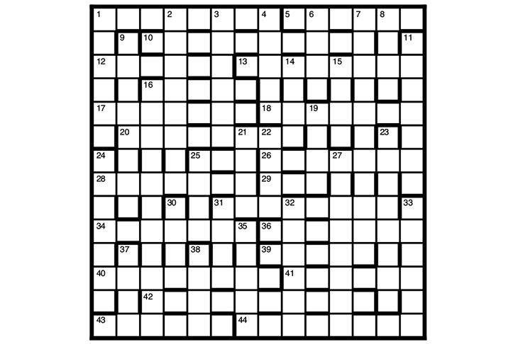 A first prize of £30 for the first correct solution opened on 16 August. There are two runners-up prizes of £20. Please scan or photograph entries and email them (including the crossword number in the subject field) to crosswords@spectator.co.uk – the dictionary prize is not available. We will accept postal entries again at some point. Apologies that there may be a delay in sending out prizes at present.