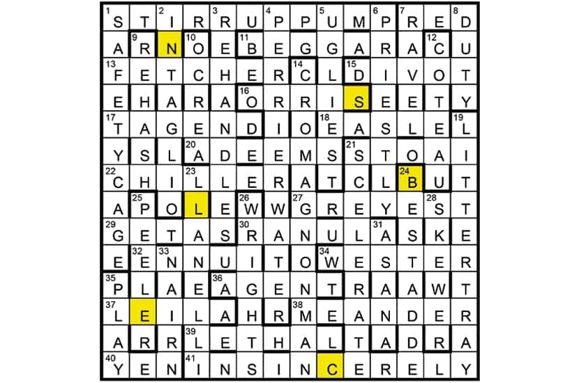 The six unclued lights and PLAYWRIGHTS (35/26) are FETCHER/Fletcher (13), CHILLER/Schiller (22), WESTER/Webster (34), MEANDER/Menander (38), PRIESTLY/Priestley (6) and COTEAU/Cocteau (12).