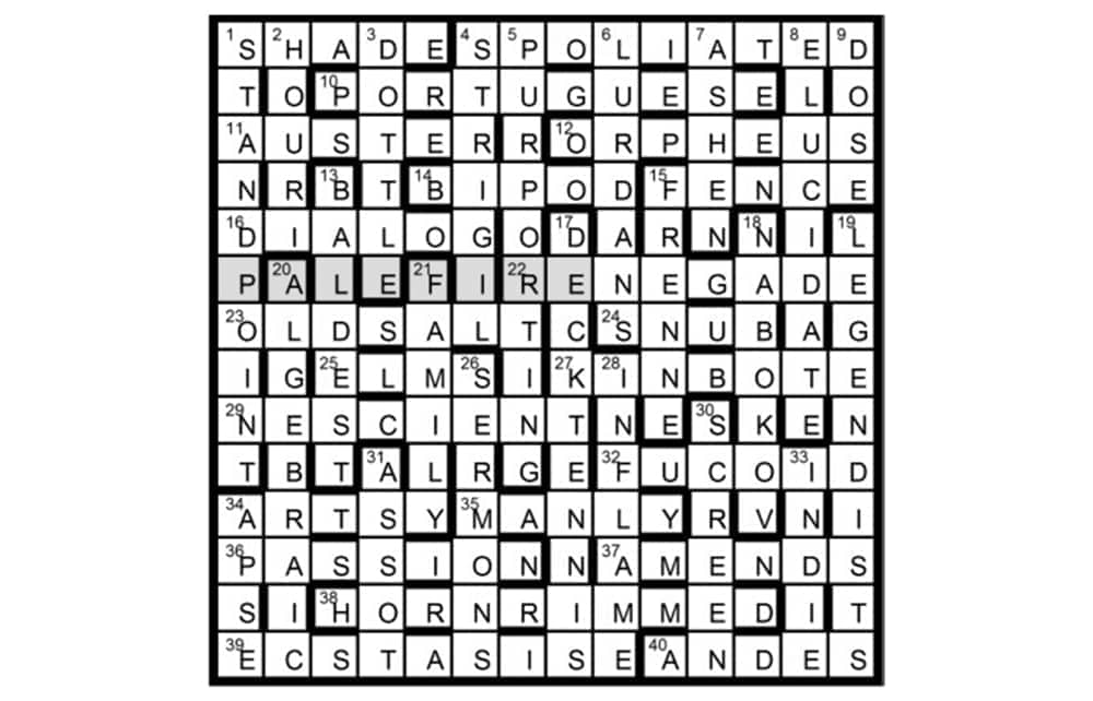 PALE FIRE is a novel by Vladimir NABOKOV (18). Synonyms of words in the novel’s title are 7, 15A, and 28, 36. Surnames of characters are KINBOTE (27), the components of which are defined by 21 and 37, and SHADE (1A), which is defined by 30 and also indicates how to treat the concealed title.