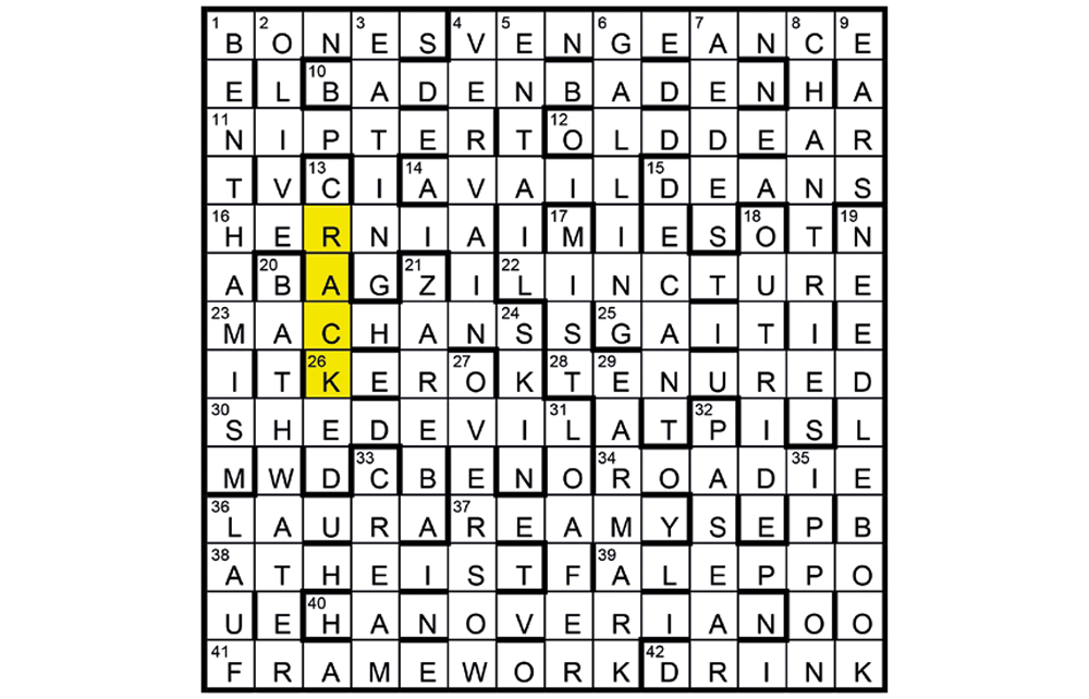 The word is ‘rack’. In the order of the headwords in Chambers, their meanings are indicated by: FRAMEWORK (41), VENGEANCE (4A), DECANT (15D), BONES (1A), GAIT (25), MIST (17), DRINK (42) and SKIN (24). RACK in CRACKED (13) was to be shaded, Title: a further meaning of rack1.