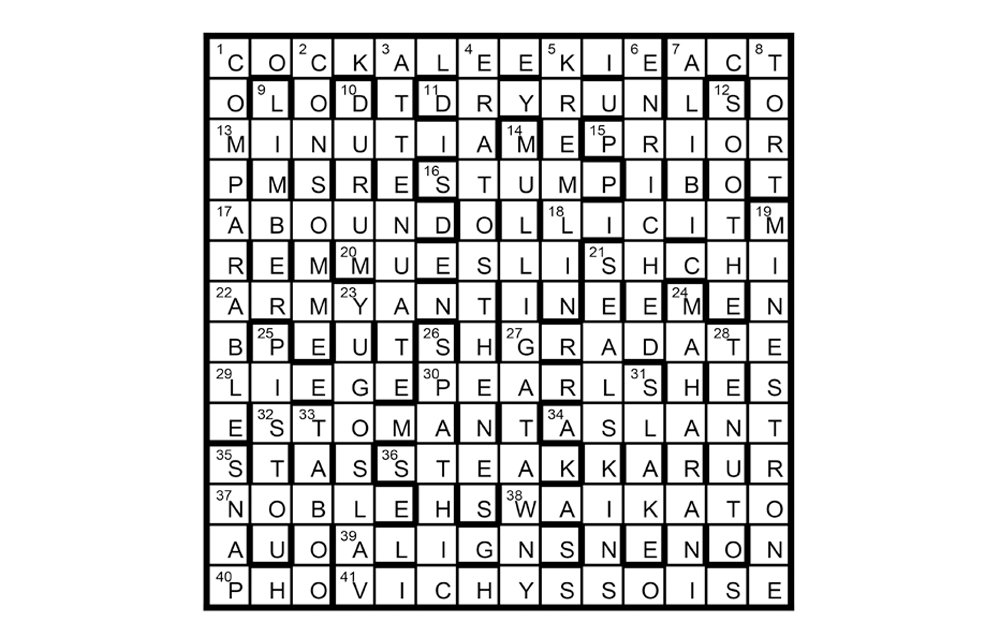 The eight unclued lights are all kinds of soup: COCK-A-LEEKIE (1A), SHCHI (21A) , PHO (40A), VICHYSSOISE (41A), CONSOMME (2D), MULLIGATAWNY (14D), MINESTRONE (19D) and PISTOU (25D). The puzzle’s title cryptically indicates the subject: ‘thus’ = SO, ‘at an end’= UP.