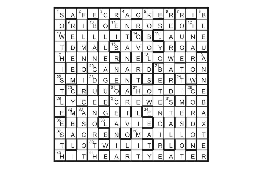 The unclued lights are French words or phrases which include a colour: 2, 10/32, 21A/7D, 21D, 28/8, 36/11, 37/8 and 38/15. Bleu at 8 does double duty, and ‘noir’ and ‘noire’ are the two forms.