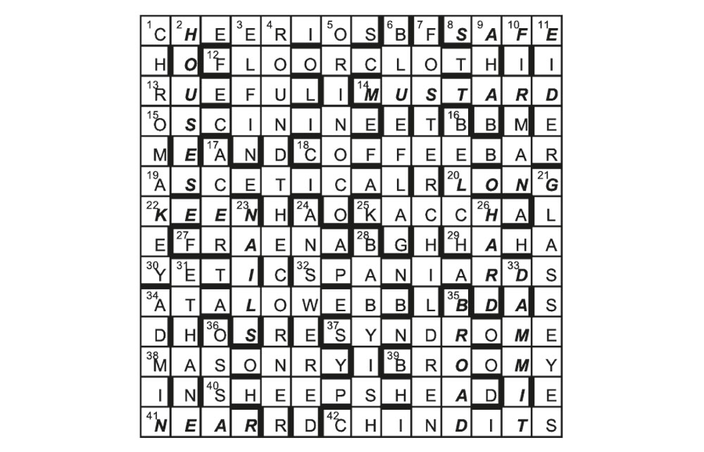 The five unclued pairs were of the form ‘[as] X as Y’, 8/2 SAFE/HOUSES, 22/14 KEEN/MUSTARD, 35/20 BROAD/LONG, 41/33 NEAR/DAMMIT and 26/23 HARD/NAILS.