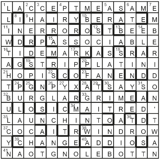 The perimeter quotation reads, ‘I don’t want to belong to any club that will accept me as a member’. The unclued lights STRIP, FAN, BOOK, GROUCHO and YACHT can all be followed by the word ‘club’; GROUCHO Marx is the source of the quotation, which is from his resignation letter to a Hollywood club.