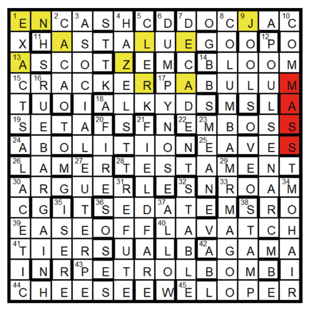 The unclued lights are the names of the principal members of the Spectator crossword compiling team since its inception in July 1981. 7 Across reveals JAC and DOC, while Mass appears in the red squares. The yellow squares can be arranged to spell La Jerazana.