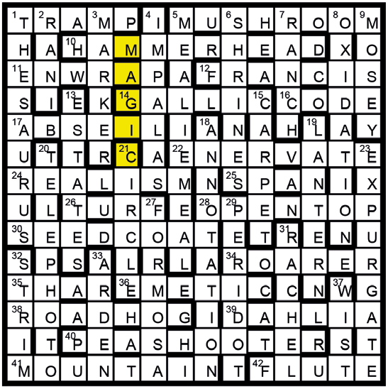 Unclued lights all follow MAGIC. (41A MOUNTAIN and 42A FLUTE should be preceded by ‘The’).