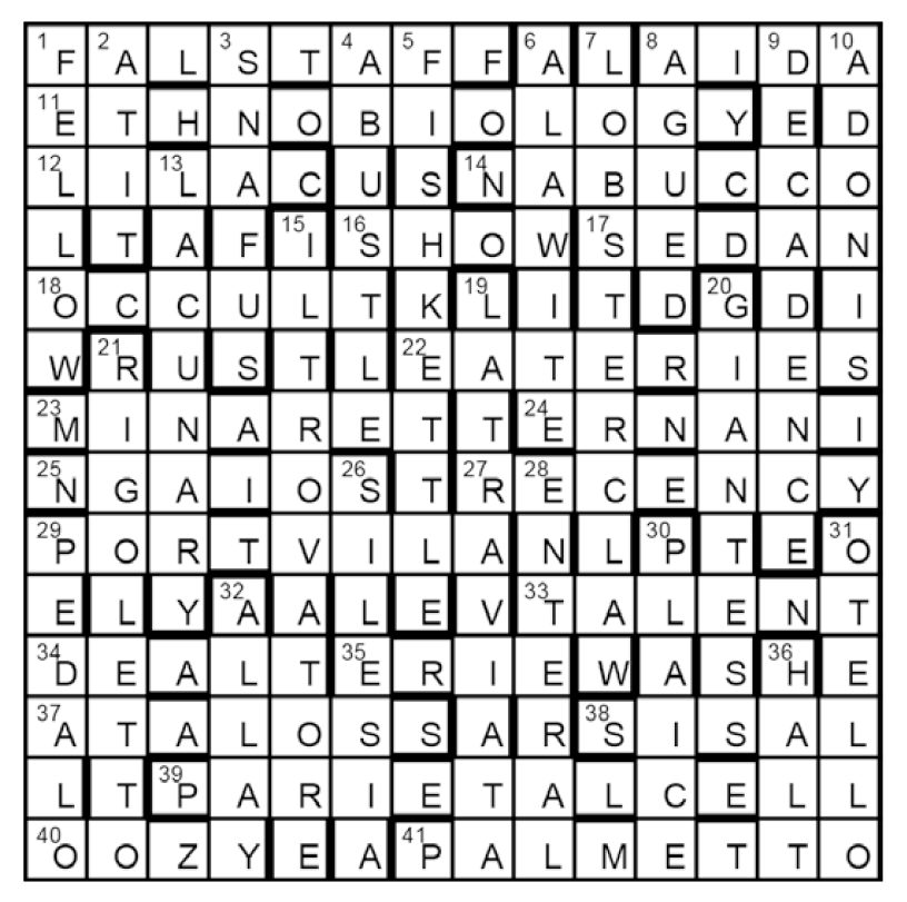 The eight unclued entries are the names of Verdi operas: FALSTAFF, AIDA, NABUCCO, ERNANI, IL TROVATORE, LA TRAVIATA, RIGOLETTO, OTELLO. The puzzle’s title suggests an anagram of the composer’s name, Verdi.