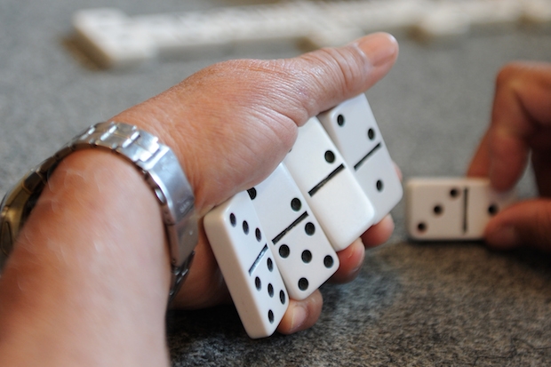 ‘Double six anybody?’ cries Oscar, five, slapping down double six to start us off on a new game. As usual, he has resolutely kept his eye on that particular domino during the shuffle and made sure he’s drawn it as one of his seven. ‘Cheating Arab,’ says Amy, laying down a six and one next to his. As if struck by divine inspiration, she adds, ‘Fancy an apple anybody?’ We all agree to eating an apple each and she passes them round. So now we’re all playing dominoes with one hand and biting an apple with the other. Bill also accepts an apple, picks up a knife and begins to peel it with his knife. ‘Aren’t you going to eat the skin?’ says Amy. ‘No,’ says Bill. ‘But it’s the best part!’ she says indignantly. ‘You have it, then,’ says Bill, prodding the circles of peel in her direction with his knife-point. ‘I’m not eating it. It’s your flaming apple,’ she says.