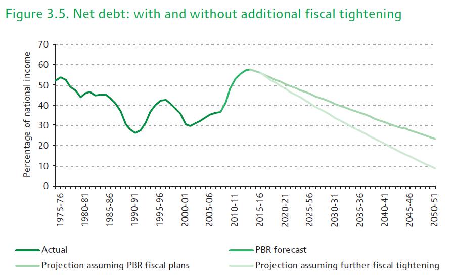 Earlier, from the IFS Green Budget launch, I wrote of how long it’s going to take for future governments to pay off Brown’s debt binge. Above is the graph, from the Green Budget, which illustrates the point. As you can see, it will take until around 2032 for us to get back to the 40% debt-GDP ratio that (officially) prevailed under Brown’s fiscal rules – and that’s assuming that governments between now and then embark on a fiscal tightening programme of spending cuts and tax hikes. Even with more severe fiscal tightening, it’s going to take until around 2025. One thing this fails to account for, though, is how much debt Brown’s hidden off balance-sheet. The real prospect facing future governments may well be far more horrific.