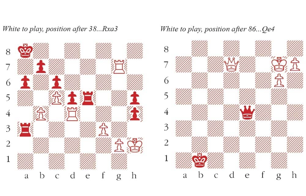 87 h8=Q Qe5+ Now 88 Kg8 Qb8+ 89 Kh7 Qh2+ looks like a draw, but… 88 Kf7! Qxh8 89 Qf5+ The crucial intermezzo Ka1 90 g7! With two queens, the checks soon run out, e.g. 90…Qa8 91 g8=Q Qa7+ 92 Kf6 Qb6+ 92 Qge6 with Qe5 to follow. Black resigns
