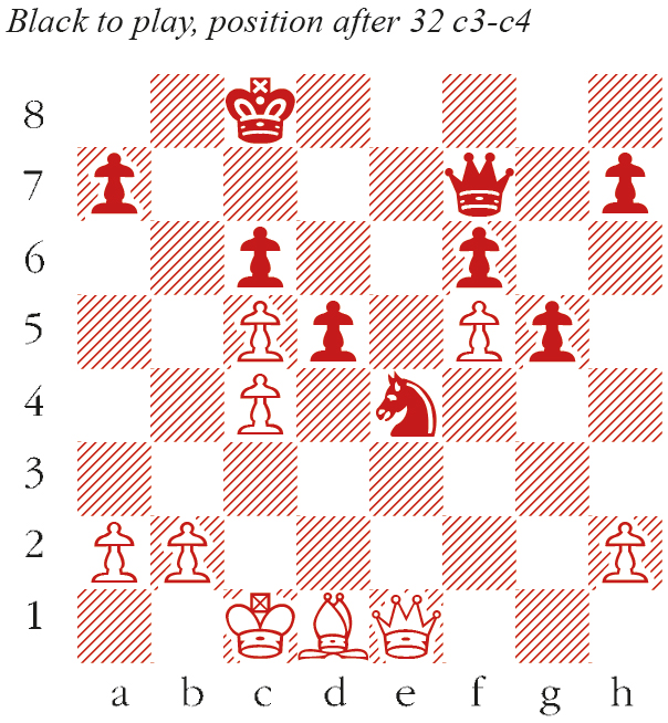 Kasparov gained a modest lead on the first day, but Anand’s biggest setback came in the first game of the second day. In the diagram below, Anand held a clear advantage with his strongly placed knight in the centre. Black has more than one promising move, of which 32…Qf7-c7, to attack h2 and prepare Qc7-f4+ was strongest.
