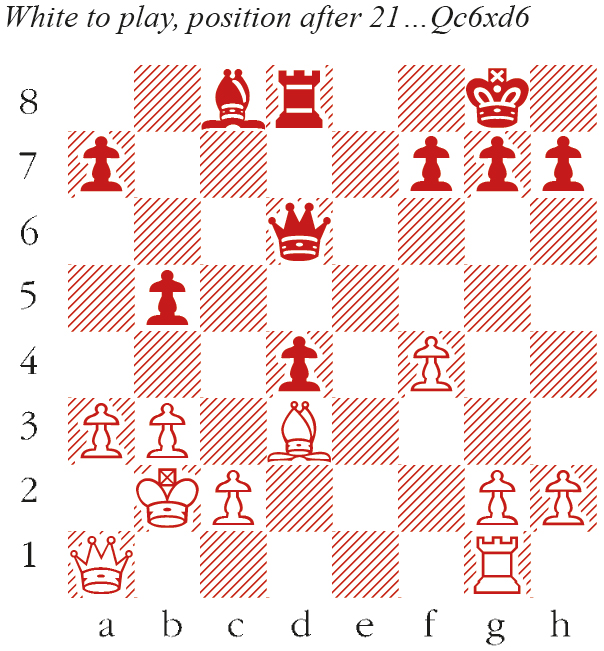 22 Qe1! Activating the queen is a higher priority than defending the f4-pawn. Qxf4 23 Qe7 Qd6 24 Qxa7 Bd7 25 Re1 g6 26 g3 Kg7 27 Re4 Bc6 28 Re7 Rd7 Expelling the rook with 28…Bd7! was more tenacious. 29 Rxd7 Bxd7 30 Qb7 Bc6 31 Qb6 Qd5 32 b4 h5 33 Qc5! Qd7 33…Qxc5 34 bxc5 followed by Kb2-b3-b4 and Bd3xb5 wins comfortably. 34 h4 f6 35 a4! The future passed b-pawn proves unstoppable. bxa4 36 Ka3 f5 37 b5 Be4 38 b6 Bc6 39 Qe5+ Kh7 Black might prefer 39…Kf7 hoping that the king might deal with the passed pawn after a queen trade, but 40 Bc4+ Kf8 41 Qf6+ mops up a lot of pawns. 40 Qc7 Black resigns