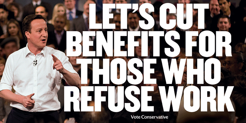 This feels like a first for this election campaign: a poster which gets quite specific on policy – and not another party’s policy either.  It comes courtesy of the Conservatives, and, as you can see above, carries the message: “Let’s cut benefits for those who refuse work”.