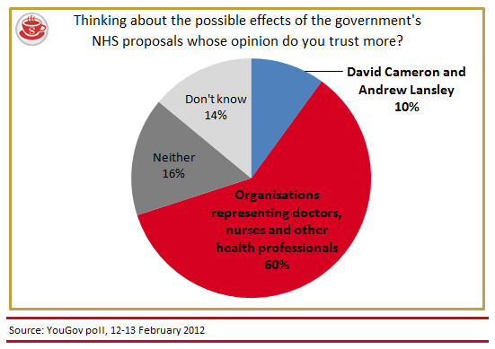 It’s not too surprising that people trust ‘organisations representing doctors nurses and other health professionals,’ well above David Cameron and Andrew Lansley, when it comes to the NHS reforms. People are sceptical of politicians in a way that they aren’t of the health service, its unions and its workers. 64 years of ‘national religion’ status for the NHS, and many more years of gross political let-down, have made sure of that.