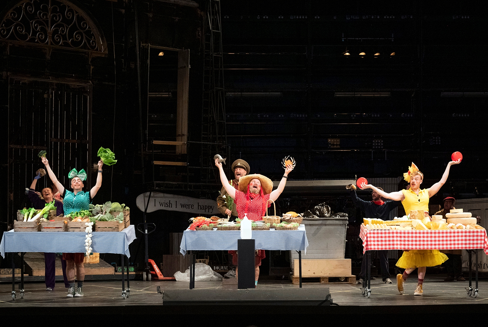 So in Stephen Langridge’s production, Offenbach’s Mesdames de la Halle becomes In the Market for Love. There’s an 18-piece orchestra in the pit and a small chorus that bustles enthusiastically to and fro, adopting heroic attitudes with root vegetables. And although it’s 2020 and there’s a big bottle of hand sanitiser centre-stage, we’re still in Offenbach’s Parisian market hall, where three working-class matrons — Mesdames Bouillabaisse (Brenden Gunnell), Beurrefondu (Rupert Charlesworth) and Mangetout (Michael Wallace) — preside over their stalls, court the superannuated Major Raflafla (Jeffrey Lloyd-Roberts) and try to work out which of them is actually the mother of the orphan Ciboulette (Nardus Williams).