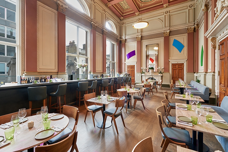 Perhaps, after Covid, we need soaring ceilings to feel safe. The proportions are exquisite. (The last Royal Academy restaurant I reviewed — the Keeper’s House — was as charming, but it was in a subterranean cave, cooled to protect the art on the walls. It was like dining in a slate mine that is also a branch of Farrow & Ball.) The walls are cream; the ceiling dusky pink; the doors pointless and fantastical.