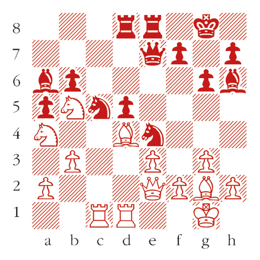 1 Nf3 d5 2 e3 Nf6 3 c4 e6 4 Nc3 b6 5 b3 Bb7 6 Bb2 Bd6 7 cxd5 exd5 8 Rc1 a6 9 Ne2 O-O 10 g3 Nbd7 11 Bg2 Re8 12 O-O Bf8 13 Qc2 c5 14 d4 a5 15 Rfd1 Rc8 16 dxc5 Nxc5 17 Nc3 Qe7 18 Nd4 Nfe4 19 Qe2 g6 20 Ndb5 Rcd8 21 Na4 Bh6! Carlsen has strong queenside pressure, but this response highlights the fierce counterplay which would arise after 22 Nxb6? Nxf2! 22 Bd4 Ba6 (see diagram) Resourceful defence. Now if 23 Nxb6 Ne6! threatens Qe7-b7 to frighten the horses. The players now plunge into a bewildering series of a dozen consecutive captures. 23 Bxc5 Nxc5 24 Nxc5 bxc5 25 Bxd5 At first glance, Carlsen has won a clean pawn, but Nakamura is ready.