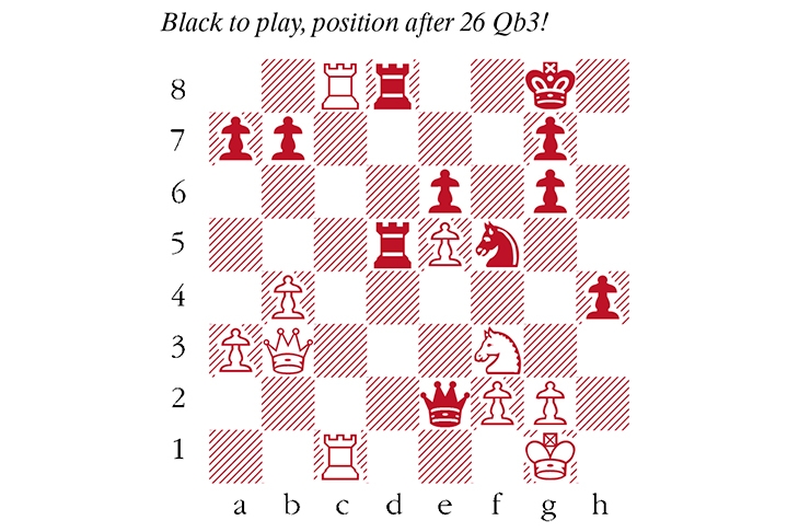 26… Rxc8! This looks risky, but White was threatening 27 Rxd8+ followed by 28 Qxe6+ 27 Rxc8+ Kh7 It is counterintuitive, but 27…Kf7 was a better defence 28 Rc1? Missing the moment. 28 Ng5+! Kh6 29 Nxe6! threatens mate on h8, so White can meet 29… Qd1+ with 30 Kh2! leaving the queen hanging on b3. After 30… g5 31 Qc4 White has a winning attack. 28… Kh6! Brave: this stops Nf3-g5+ 29 Re1 Qd3 30 Qb2 Qc4! Another important move, preventing Qb2-c1+. 31 Qb1 g5 32 Re4 Qd3 33 Qxd3 Rxd3 With an extra pawn, the endgame is comfortably winning 34 a4 Kh5 35 Kf1 g4 36 Nh2 g3 37 Nf3 Ra3 38 Rc4 Ra1+ 39 Ne1 g5 40 Rc8 Ra2 41 Rh8+ Kg6 42 Nd3 Rd2 White lost on time.