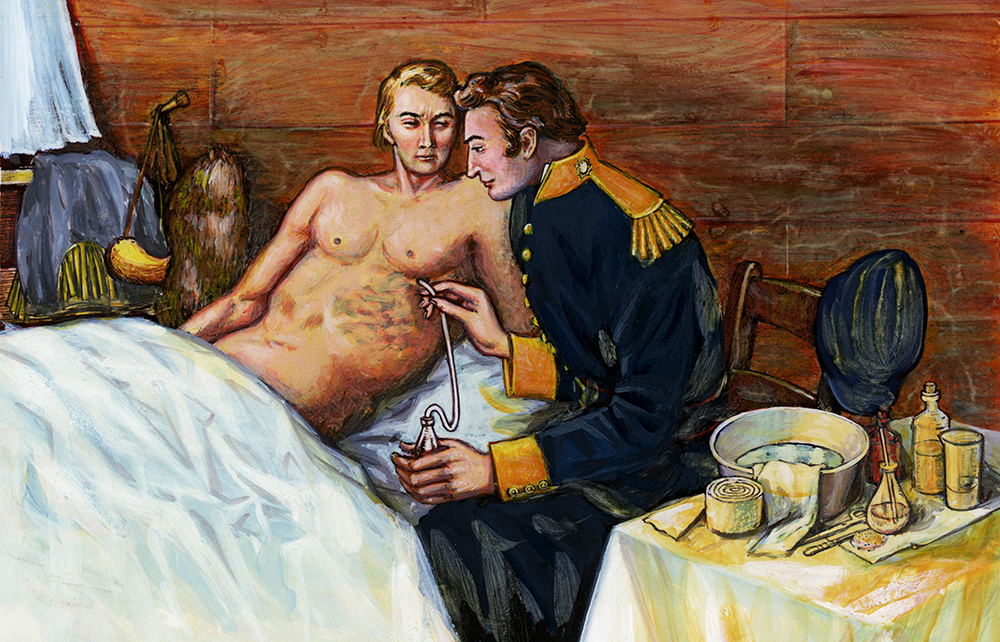 When Beaumont finds him, the boy’s wound is healing, but into a fistula: Alex has a hole under his ribs leading directly to his gut. Where others see a freak, the doctor sees scientific opportunity. Already convinced that acids play a role in digestion, Beaumont persuades Alex to partner with him to prove this. ‘We will be as two men in the snow.’