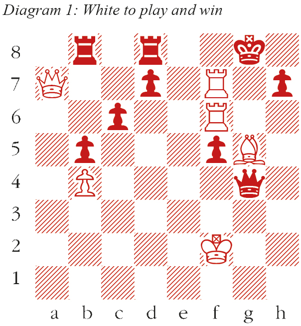 1 Rg6+!! hxg6 1…Kxf7 2 Qa1 comes to the same thing 2 Qa1! Kxf7 3 Qf6+ Kg8 4 Bh6 White wins as the desperate 4…Qh4+ is the only means to prevent Qf6-g7 mate, whereupon White has an easily won game.