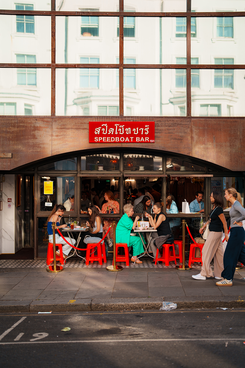 Now comes the Speedboat Bar, shaped like a train carriage with an open kitchen and monochrome floors, but floral: a hangover from the diner. The walls are pale marble – again, this feels assembled from other restaurant parts, a Franken-restaurant, and pleasing – and hung with photographs of normal Thai restaurants across the world. As if it is lonely among the doughnuts and the biscuit triptychs – and who wouldn’t be, because who communicates in biscuit? There is a games room at the back for the immature, and it all feels brighter than it really is: as if it bathes in neon for solace. The menu is simple, for a lovechild of the 1960s, written in bubble font: snacks; salads; stir fries; specials; curries. They are southern Thai, plus Chinatown in Thailand, as brightly lit and gaudy as the Speedboat Bar itself, cooked by British chefs who love Thailand, and make this frenzied version of it for the congenitally numb of west London. The chicken skins with zaep seasoning are a punch with salt, and we cannot eat them. The sweetcorn fritters are better, and immense; the crispy pork with prik nam som sauce is adequate, if cool to the touch; the minced beef with holy basil is fiercer than usual, and lovely; the cellophane noodles with chicken are dull but fine.