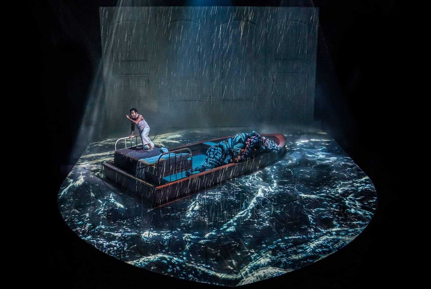 Later, the tiger turns into an actual human being. Pi suffers an attack of heat-stroke and has a hallucination in which the tiger appears as a drunken French sailor, sitting on a bench, legs crossed, cracking jokes. The lighting effects are dazzling too. The flat wooden stage comes alive and turns into a rippling, moving body of water. This amazing technical achievement should be seen, and marvelled at, by anyone with an interest in making stage scenery. And don’t worry about buying cheaper seats in the upper galleries. Your view of the effects may be better from on high than down in the stalls.
