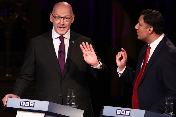 ‘In 23 days’ time the Tories could be gone’, Sarwar announced, in case anyone was had forgotten. To which the SNP leader, John Swinney, replied tartly: ‘But they’ll be replaced by an austerity-welding Labour government and £18 billion of public spending cuts according to the IFS’. Aye, ye canny trust the Red Tories as every nationalist knows. ‘Westminster holds Scotland’s purse strings’, Swinney went on, ‘and Labour are not being straight on spending’.