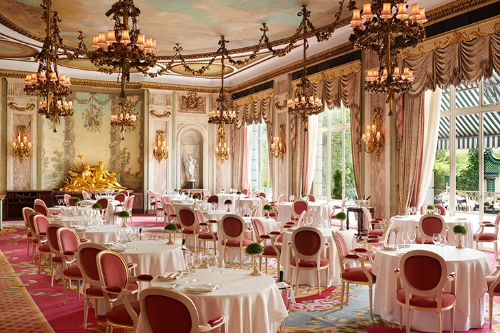 This room is pink and gold, mirrored and flounced. If it is the origin myth of the Mattel Barbie Star Light Starlight Adventure Galaxy Castle Playset, that does not detract from its charm. I love this dining room, and this is good, because it is stuck this way, and I love the metaphor too: a Belle Époque room that cannot die because it is Grade II listed. It is gilded enough to please Prince Ludwig of Neuschwanstein castle — surely another origin myth of the Mattel Barbie Star Light Starlight Adventure Galaxy Castle Playset — and it cannot be made grey or fawn or stone like the inside of a Volvo or a yacht. It exists as a stopped clock, and that must pass for stability nowadays.