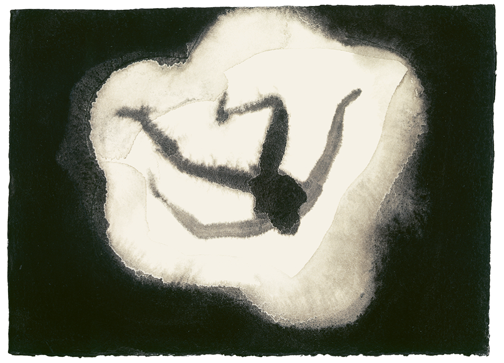Many of the works in these pages, which Gormley has made throughout his long career, depict a lone male figure in a featureless environment, a man emerging as though from a Rorschach blot. Others are more abstract: grids, lung-like shapes, sunspots on the back of an eyeball. One of the artist’s attractive qualities is a willingness to let chance lend a hand. For his ‘Body and Light’ series, he soaked paper in water before applying pigment and leaving it overnight so that the images were ‘arising’ beyond his control.