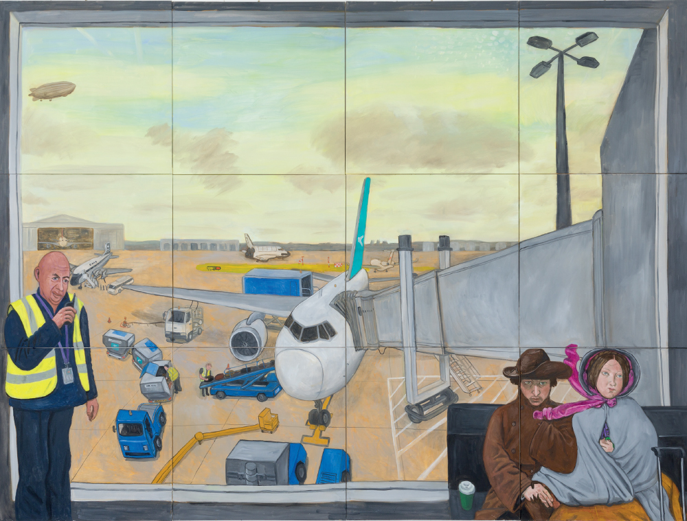 The Japanese-born artist Jiro Osuga has spent much of his life looking at parts of the urban fabric the rest of us ignore and giving them a surreal twist in paint. For his latest exhibition, Departures, he has transformed 160m² of Flowers’ east-London gallery into an airport. Everything is recreated at scale: check-in desks, departure gates, travellator, café, duty-free shop, baggage-reclaim carousels. The giveaway is the smell of oil paint and the presence among the travellers of some very odd customers: a robot asleep across three seats, a Roman in a toga descending an escalator, two octopuses pushing a luggage trolley, a group of ancient Egyptians awaiting boarding. Friedrich’s ‘Wanderer above the Sea of Fog’ gazes out across the tarmac; Ford Madox Brown’s forlorn couple from ‘The Last of England’ sit glumly awaiting embarcation (see below).