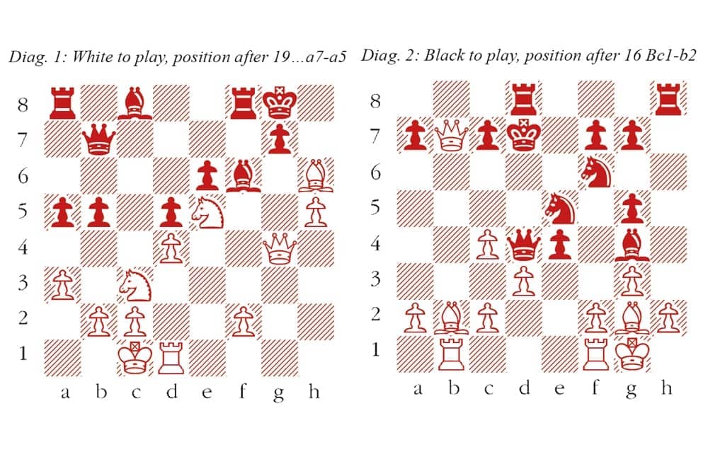 1 e4 e5 2 Nf3 Nc6 3 g3 Nf6 4 d3 d5 5 exd5 Qxd5 6 Bg2 e4 7 Nc3 Bb4 8 Ng5 Bg4 9 Qd2 Bxc3 10 bxc3 O-O-O 11 O-O Ne5 12 c4 Qd4 13 Rb1 h6 14 Qb4 hxg5 15 Qxb7+ Kd7 16 Bb2 (see diagram 2) Rxh2!! A move of astounding force. After 17 Bxd4 Rxg2+ 18 Kxg2 Bf3+ 19 Kg1 Rh8 20 Qb5+ c6 21 Qb7+ Ke6 the checks expire and mate on h1 is imminent. No better is 17 Kxh2 Rh8+ 18 Kg1 Nf3+ 19 Bxf3 Bxf3, with mate soon to follow. White resigns