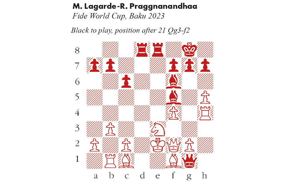 1 e4 e5 2 Nf3 Nc6 3 Bb5 Nge7 4 Nc3 The Cozio defence (3…Nge7) against the Ruy Lopez contains a splendid trap in case of 4 O-O Ng6 5 d4 exd4 6 Nxd4 Bc5 7 Be3 Bxd4 8 Bxd4 Nxd4 9 Qxd4 Qg5. White’s best response is 10 e5, but what could be more natural than 10 Nc3, defending the loose bishop on b5? In fact, Black wins on the spot with 10…Nh4 11 g3 Nf3+, a sequence which has tripped up hundreds of players in online play. Ng6 5 d4 Nxd4 6 Nxd4 exd4 7 Qxd4 c6 8 Be2 Qb6 9 Qd3 Be7 10 f4 An ambitious approach from the inventive French grandmaster. O-O 11 h4 d5 Accelerating development is paramount. It is much too risky to grab a pawn with 11…Bxh4+ 12 g3 Be7, when the open file for the Rh1 spells trouble. 12 h5 dxe4 13 Qg3 If the knight retreats to the corner, Lagarde would have reason to be optimistic. But what follows is far stronger: Nh4! 14 Rxh4 Qg1+ 15 Bf1 e3! The crucial detail, which had to be seen before venturing 13…Nh4. 15…Bxh4 16 Qxh4 would nominally restore the material balance, but the knight and bishop would be far superior in a middlegame with only one open file for the rooks to play on. 16 Nd1 Re8 17 Ke2 A grim necessity, as 17 Bxe3 Bxh4 18 Qxh4 Rxe3+ 19 Nxe3 Qxe3+ is still catastrophic for White. Be6 18 b3 Preventing the check on c4, which would be fatal in the event of any capture of the e3 pawn. Rad8 19 Nxe3 Bf6 20 Rb1 Bf5 21 Qf2 (see diagram) Allowing a pretty tactic, but White could hardly move. 21 Bb2 Bxb2 22 Rxb2 was a plausible try, but 22…Re4 would prepare Rd8-e8, and 23 b4 (intending Rb2-b3) Be6 threatens check on c4 again. Then 24 Qf2 Rd2+ wraps up the game. Bxh4! With the lovely point that 22 Qxg1 Bg4 is mate! Not 21…Qxf2+ 22 Kxf2 Bxh4+ 23 g3 leaving both bishops under attack. 22 Qxh4 Bxc2 23 Qxd8 Rxd8 24 Nxc2 Three minor pieces are a match for the queen when they have a measure of coordination. But here everything in White’s camp is loose, so the queen is in her element. Qc5 25 Ne3 Re8 26 Kf3 Qd4 27 Ke2 Qc5 28 Kf3 Qxh5+ 29 g4 Qh1+ 30 Kg3 Re6 31 Bd2 h5 32 gxh5 Qxh5 33 Re1 Rg6+ 34 Kf2 Qh4+ 35 Kf3 Qg3+ 36 Ke4 Rd6 37 Re2 f5+ White resigns