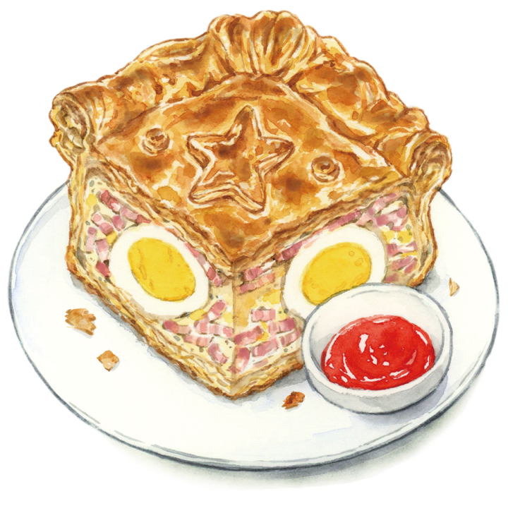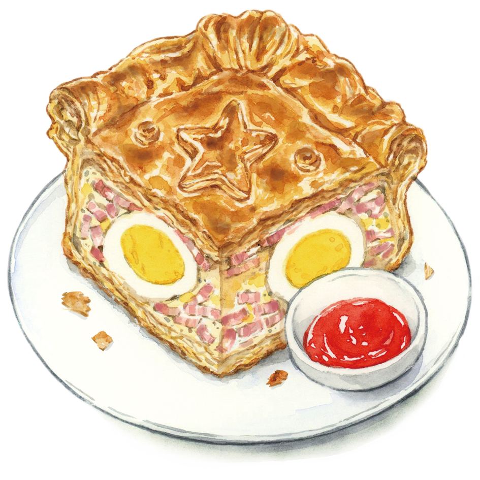For the uninitiated, it is (and I ask every Kiwi reading to look away now and rejoin us at the next paragraph) a lot like a quiche Lorraine encased in puff pastry. Popular additions include raw onion, cooked onion, leeks, grated cheese and tomato chutney or relish. At its most essential, however, it is made of just three ingredients: bacon, eggs and flaky pastry, even if within these defined parameters, there are both rules and potential slip-ups. The bacon should be smoked, lean and thick-cut – use rashers at your peril. And sure, there are egg factions, too: to prick or not to prick the yolks of the eggs? Or, throw caution to the wind and just scramble the whole lot? Ever the peacemaker and fence-sitter, I opt for a combination, with a base of beaten egg, topped with carefully placed whole eggs, which hard-cook in the oven as the pie bakes, creating a pleasing cross-section of bright white and round yolk when this pie is sliced.