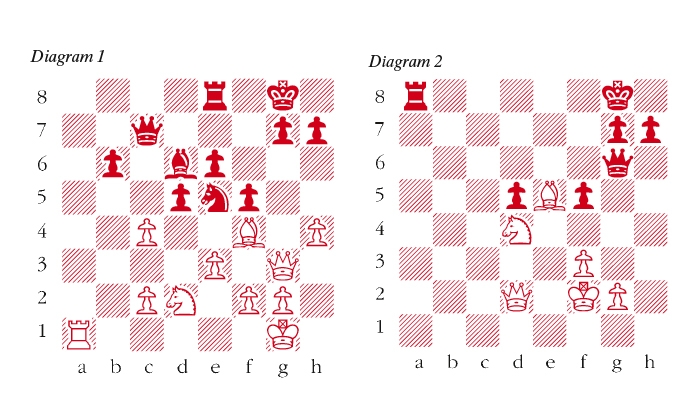 1 d4 d5 2 Bf4 Seemingly unpretentious. Indeed, allowing Black to develop his own queen’s bishop on f5 without repercussions indicates an entire absence of ambition by White in this opening. However, as is well known, Carlsen rarely strives for any kind of theoretical advantage in the opening stages. 2 … Bf5 3 e3 e6 4 Bd3 Bxd3 5 Qxd3 This position, with the early trade of bishops, would usually be regarded as sterile. Carlsen, though, in the style of his role model Emanuel Lasker finds ways to maintain the tension. 5 … c6 6 Nd2 Nf6 7 Ngf3 Be7 8 0-0 0-0 9 h3 Nbd7 10 a4 c5 11 a5 c4 12 Qe2 b5 13 axb6 axb6 14 Ne5 Nxe5 15 dxe5 Carlsen starts to take risks. The alternative capture 15 Bxe5 is completely level. 15 … Nd7 16 Qg4 Re8 17 h4 f5 Shoring up his defences. The cautious Giri avoids 17 … Rxa1 18 Rxa1 Bxh4 19 e4 which is by no means clear. 18 Qh3 Rxa1 19 Rxa1 c3 Instead of offering a pawn Black should now seize one. After 19 … Bxh4 20 g4 White will be hard-pressed to justify his ambitious play. 20 bxc3 Qc7 21 c4 Nxe5 Uncharacteristically, Giri also starts to take risks. This could have cost him dear. 21 … dxc4 is safe and sound. 22 Qg3 Bd6 (see diagram 1) 22 … Bf6 fails to 23 Kh1 followed by Nf3. 23 cxd5 White misses a win with 23 c5!! bxc5 24 Ra6 when there is no defence to 25 Rxd6 and Bxe5. 23 … exd5 24 Nb3 Qxc2 25 Nd4 Qc8 26 h5 Qd7 27 Rb1 Bc7 28 f3 Qf7 29 Ra1 Bd6 30 Ra6 Qxh5 31 Rxb6 Nc4 32 Rxd6 Nxd6 33 Bxd6 Rxe3 34 Be5 Qg6 35 Qf4 Re1+ 36 Kf2 Ra1 37 Qd2 Ra8 (see diagram 2) A blunder. 37 … Qa6 should hold. 38 Nxf5 Qe6 Of course 38 … Qxf5 fails to 39 Qxd5+. 39 Qg5 g6 40 Nh6+ Kf8 41 Ng4 Ke8 42 Nf6+ Kf7 43 Nxh7 Ra4 44 Qd8 Ra2+ 45 Kg1 Black resigns After 45 … Qxe5 46 Qf8+ Ke6 47 Qe8+ Kd6 48 Qb8+ Ke6 49 Nf8+ Kf5 50 g4+ followed by a knight fork wins the queen.