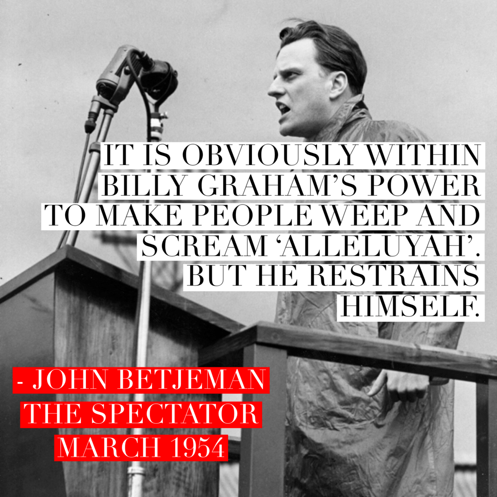 Billy Graham, the American evangelist, has died at the age of 99. Here John Betjeman recounts his experience of attending one of Graham’s Greater London Crusade events, in an article first published in the Spectator in March 1954