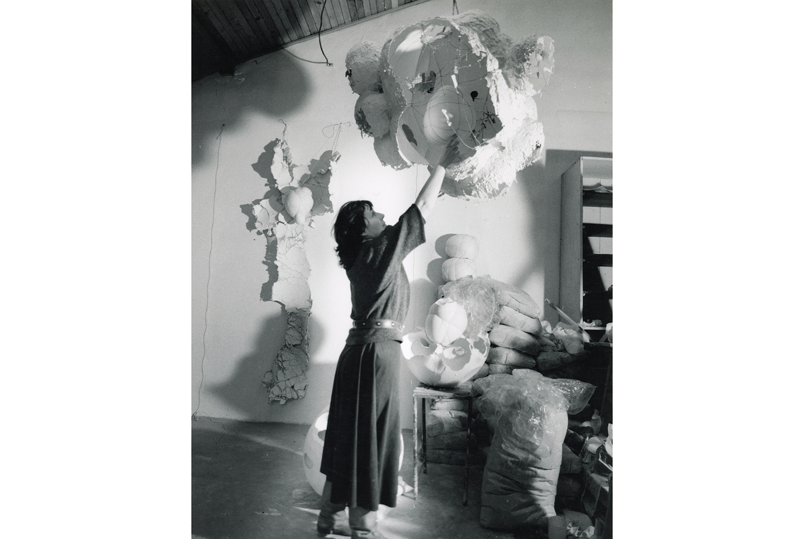 Trained in ceramics at Prague Academy of Arts under communism, Bartuszova turned to plaster after moving with her sculptor husband Juraj Bartusz to the industrial city of Kosice, now in Slovakia, in 1963. Plaster was cheap and plentiful: a 1987 photo in this exhibition, the first to bring her work to a British audience, shows her with stacks of sacks of it in the studio. The natural forms she initially cast from it – raindrops, wheat grains, eggs, germinating buds and dividing cells – feel pregnant with life. She called the process ‘gravistimulation’, manipulating the gypsum as it set, sometimes underwater to counter the effects of gravity. Malleable, squidgy, dimpled by the sculptor’s hand, suspended like caciocavallo cheeses, bound with cord like Nobuyoshi Araki nudes or twisted into intestinal coils like Sarah Lucas’s ‘Nuds’ made of stuffed tights, the forms are not just palpable, they’re palpatable – they tempt the viewer to cop a quick feel. To Bartuszova, an enlarged grain of wheat is as inviting as Mae West’s lips in a Dali sofa. There are other echoes of the human body: incompletely inflated balloons terminate in nipples and wrinkly knots recall other parts of the anatomy. Some forms have unforeseen associations: to a contemporary eye, the models for her two-part sculpture, ‘Metamorphosis’ (1982), for Kosice crematorium look like oozing cheeseburgers.