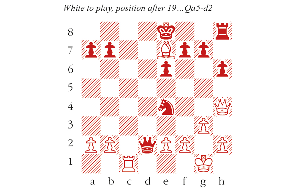 1 d4 Nf6 2 c4 e6 3 Nf3 d5 4 g3 dxc4 5 Bg2 c5 6 O-O Nc6 7 Qa4 Bd7 Being greedy with 7…cxd4 doesn’t work out well here: 8 Nxd4! Qxd4 9 Bxc6+ Bd7 10 Rd1! Bxc6 11 Qxc6+ bxc6 12 Rxd4 leaves Black with a blighted pawn structure. 8 Qxc4 cxd4 9 Nxd4 Rc8 10 Nc3 Nxd4 11 Qxd4 Bc5 12 Qh4 Bc6 Grandmasters of Duda’s calibre suffer calamities in the opening only very rarely. But it happened in a game in Dusseldorf earlier this year, where Wesley So played 13 Rd1, which Duda met with 13…Qb6. After 14 Bxc6+ Rxc6 15 Bh6! Black was in huge trouble, e.g. 15…O-O 16 Bxg7! Kxg7 17 Qg5+ is awful, while 15…Bxf2+ 16 Kg2 only exacerbates the problem. Duda tried 15…Bf8 but after 16 Rd3, his position was already beyond repair, since his king could not escape the centre. This trap has been known at least since the game Portisch-Radulov in 1978, claiming 20 victims, including several grandmasters. 13 Bxc6+ Rxc6 14 Rd1 Qa5 Duda is ready with his improvement on the game mentioned above. The purpose of placing the queen on a5 is that 15 Bh6 O-O 16 Bxg7 Bxf2+! works out fine for Black, as after 17 Kxf2 Kxg7 the g5 square is guarded so the position is equal. 15 Bg5 Be7 16 Rac1 h6 I suspect that Duda was trying to lure Carlsen into a trap here, but it backfires spectacularly. Better was 13…O-O, when 14 Ne4 Qe5 15 Nxf6+ Bxf6 16 Bxf6 gxf6 is about equal. 17 Ne4 Rxc1 17…Qe5 was the lesser evil, but 18 Rxc6 bxc6 19 Nxf6+ Bxf6 20 Bxf6 gxf6 21 Qb4 is grim to behold. 18 Rxc1 Nxe4 19 Bxe7 Qd2 (see diagram) Duda’s point is that White cannot win a rook: 20 Rc8+ Kd7 21 Rxh8 Qe1+ 22 Kg2 Qxf2+ 23 Kh3 Qf1+ 24 Kg4 Qf5 mate. 20 Bg5! Spectacular. The h6-pawn is pinned, while after a queen exchange on g5 White could collect the Rh8 with Rc8+. 20…Qxe2 21 Be3! Nd6 22 Qd4 also wins easily. All that remains is the move Duda tried: Nxg5 21 Rc8+ Ke7 22 Rxh8 Qxe2 23 Qb4+ Kf6 24 Qf4+ Kg6 25 Kg2 With a safer king, Duda would be in with a chance, but Carlsen soon creates decisive threats. e5 26 Qe3 Qxb2 27 h4 Ne6 28 Qe4+ Kf6 29 Re8 Qb5 30 Rb8 Nc5 31 Qd5 a6 32 Rf8 Black resigns