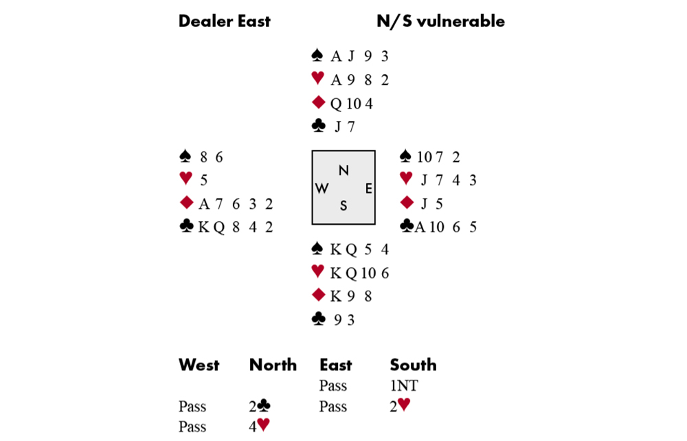 If a strong player does this, it’s a good indication that trumps are 4-1, and you might just find the way home; ruff in dummy, play Ace of Hearts and a Heart, and – when East follows – close your eyes and insert the ten. You can then go after your trick in Diamonds, and if West persists with a Club, it can be ruffed with dummy’s last trump and you have ten tricks.