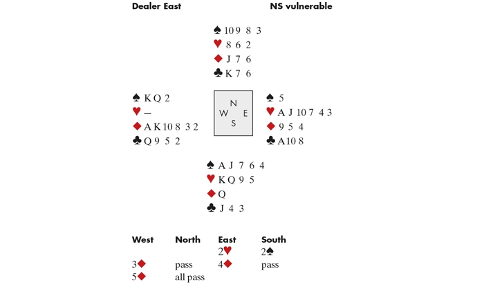 Peter (North) made an aggressive lead: a small club away from his king. Declarer played the ♣8 from dummy. South played the ♣J (unless he thinks his partner has led from KQx, he should really play low), and now declarer was able to finesse the ♣K: he ended up losing just a spade and a trump. Afterwards, the criticisms began: why didn’t Peter lead a spade? Peter pointed out that if South wins with the ♠A, declarer has discards for dummy’s clubs; if South plays low, declarer wins, ruffs two spades, and can play the clubs for one loser. Then you should have led a heart, said his partner. No: declarer wins in dummy and leads a spade, giving South the same losing options. Well, a trump lead would have broken his communications. Yes, a trump was probably best, agreed Peter — but if declarer ducks South’s ♦Q, South has no good return — so no lead whatsoever beats the contract!