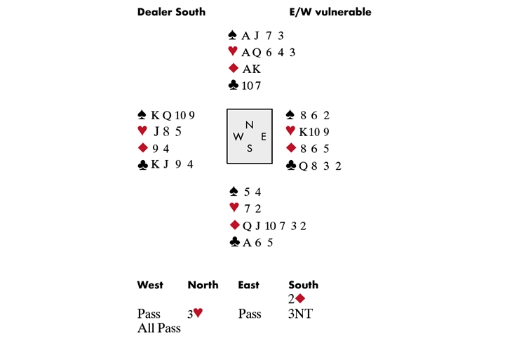 North had an almost impossible bid over the weak 2♦. She chose the forcing 3♥ and at least got her best suit in, but Peter declined to support in favour of his favourite hunting ground — 3NT.