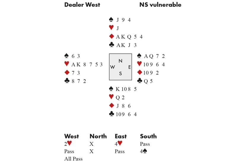 At the other table, Jonathan was sitting West. When his partner, Steve Root, played the ♥10 under the Ace, Jonathan smacked down the King, forcing dummy to ruff. When Steve took the second trump, he was therefore a step ahead, and could simply force declarer for one down.