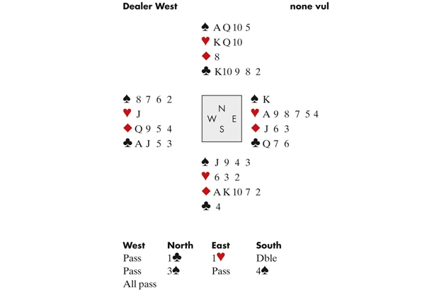 South’s double promised four spades. West led the ♥J. East won and played back the ♥7, ruffed. West switched to a trump. What now? Artur reasoned that since EW were playing weak-jump overcalls, and West had overcalled hearts at the 1-level, he must be fairly strong. If he held the ♣A he would surely have played his lowest heart for West to ruff, asking for a club return. Therefore, West held the ♣A, and East must surely hold the ♠K. Artur rose with the ♠A – bingo.