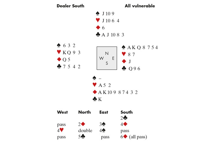 Here’s one of my favourite hands from the European Open Championships — although it caused David Gold to spend the next hour kicking himself. David is a world-class player, but even Homer nods, and after days competing in a sweltering tent in the Tuscan countryside, he made a small error which led him to go down in a slam. He realised it a second later — exactly the same time as one of our opponents, the Russian champion Andrey Gromov, who leaned over to point it out, only for David to cut him short with a forlorn ‘I know’. Mind you, only an expert would consider it an error; most of us would never have spotted it. Indeed, I had no idea what he meant until he drew the five-card ending for me: