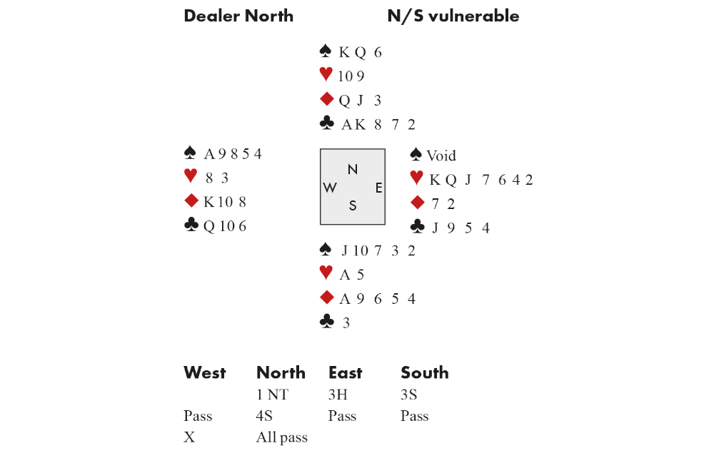 West’s double is by no means a certainty; she’s got no particular reason to believe the freely bid game should go down, but if things go badly for declarer, it could go several off, so there’s some reasonable equity in upping the ante a bit. Not this time though.
