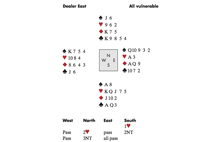 South took the modern view that his hand was stronger than the 15–17 confines of a strong no-trump, electing instead to upgrade it (showing 18–19) and his partner raised to game. My partner (Artur Mali) led the ♠4, which went to the Jack, Queen and Ace and declarer played a high heart to my Ace. I continued with ♠10 which Artur won with his King and returned the ♠7 which I overtook with the ♠9 and carefully selected the ♠3 — ostensibly blocking the suit. Artur initially looked like he was going to explode but, professional that he is, went into the tank and tried to make some sense of the loony defence. He knew ♠2 was still out, so maybe the 3 was suit preference and, if it was, that suit would be diamonds. I don’t think he believed for a moment that I knew what I was doing but he plonked 8 on the table and we took the contract 3 off vul! Brainiac or maniac? Opinion is divided.