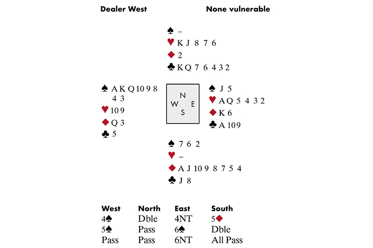 South’s double of 6♠ indicated he wanted a ruff: a heart lead defeats 6♠ so Hoftaniska did well to pull to 6NT. On a non-club lead, the contract is cold. When South led the ♣J, it looked doomed. But just look at the way Hoftaniska made it: he won the ♣A, then cashed all but one spade. In the 5-card ending, he was in dummy with ♠3 ♥109 ◆Q3 opposite ♥AQ5 ♣109. North had come down to ♥KJ8 ♣KQ. On the last trump, he was squeezed; he couldn’t release a heart so he threw the ♣Q. Hoftaniska discarded the ♥5, played a heart to the ♥Q and then a club. North won and was forced to return a heart. The ♣9 was Hoftaniska’s 12th trick. It was perhaps a little harsh of North to point out to South at the end that a small club lead, not the ♣J, would have defeated the contract!