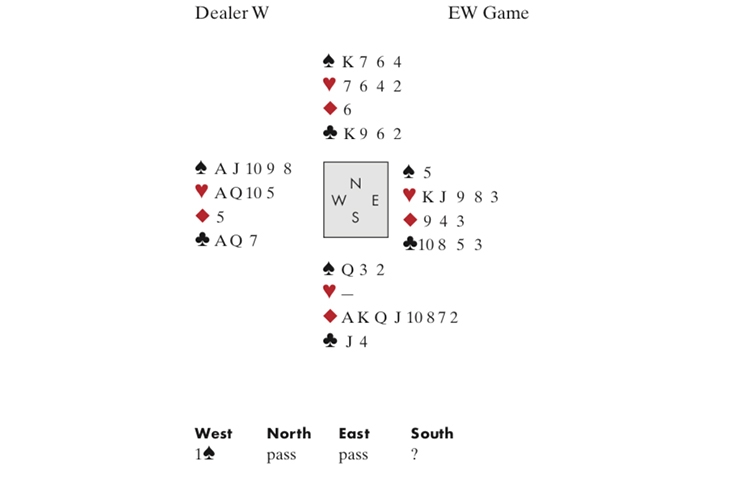 However, I’m hardly one to talk, as the other day I did something far more outrageous with my beautiful 8-suiter — and I haven’t stopped being teased since. The event was the Ian Gardiner Teams of Four, and I was playing with my Scottish friend Paula Leslie. I picked up this hand: ♠Q32 ♦AKQJ10872, ♣J4. The opposition were vulnerable, and my left-hand opponent opened 1♠. Two passes to me… What would you bid? Here is the full deal: (see image).