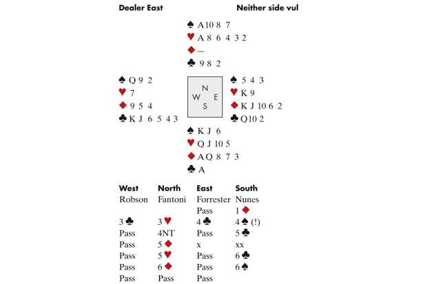 A right old balls-up. Nunes obviously thought Fantoni’s 3♥ was a transfer to spades, Fantoni thought Nunes’s 4♠ was natural — and off they went. Forrester’s diamond double asked partner not to lead the suit. Robson led his singleton heart. Nunes rose with the ace and played a club to his ♣A, then ran the ♥Q. Robson discarded a club, Forrester won and switched to the ♦J. This was an excellent play: the whole hand was about locating the ♠Q. Had Forrester played a club, Nunes would have had to ruff in hand, and would then have no choice but to cash the ♠K and run the ♠J in the hope Robson held ♠Qxx. A diamond return allowed Nunes to discard both losing clubs on the ♦Q and ♦A — so he no longer had to ruff one. Nunes continued with a spade to the ♠A, and one back to Robson’s ♠Q! Why was this so bad? Because, in bridge parlance, he had ‘insulted’ Forrester. If Forrester had held the ♠Q, a club return would have defeated Nunes. Did he really think a player of Forrester’s calibre would have played a diamond away from his ♦K without good reason?