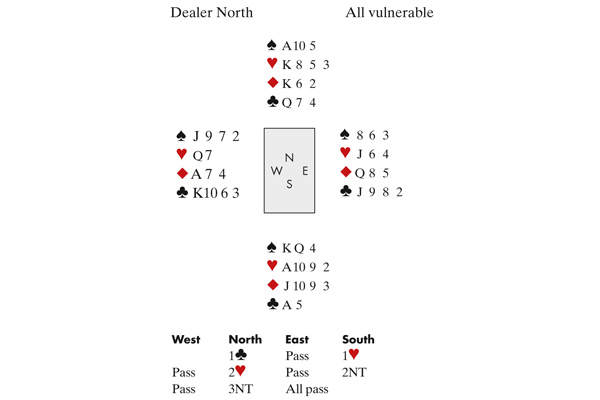 2NT was forcing for a round, and Susan in North’s seat showed great judgment by ignoring the 4–4 Heart fit and raising to the best game.